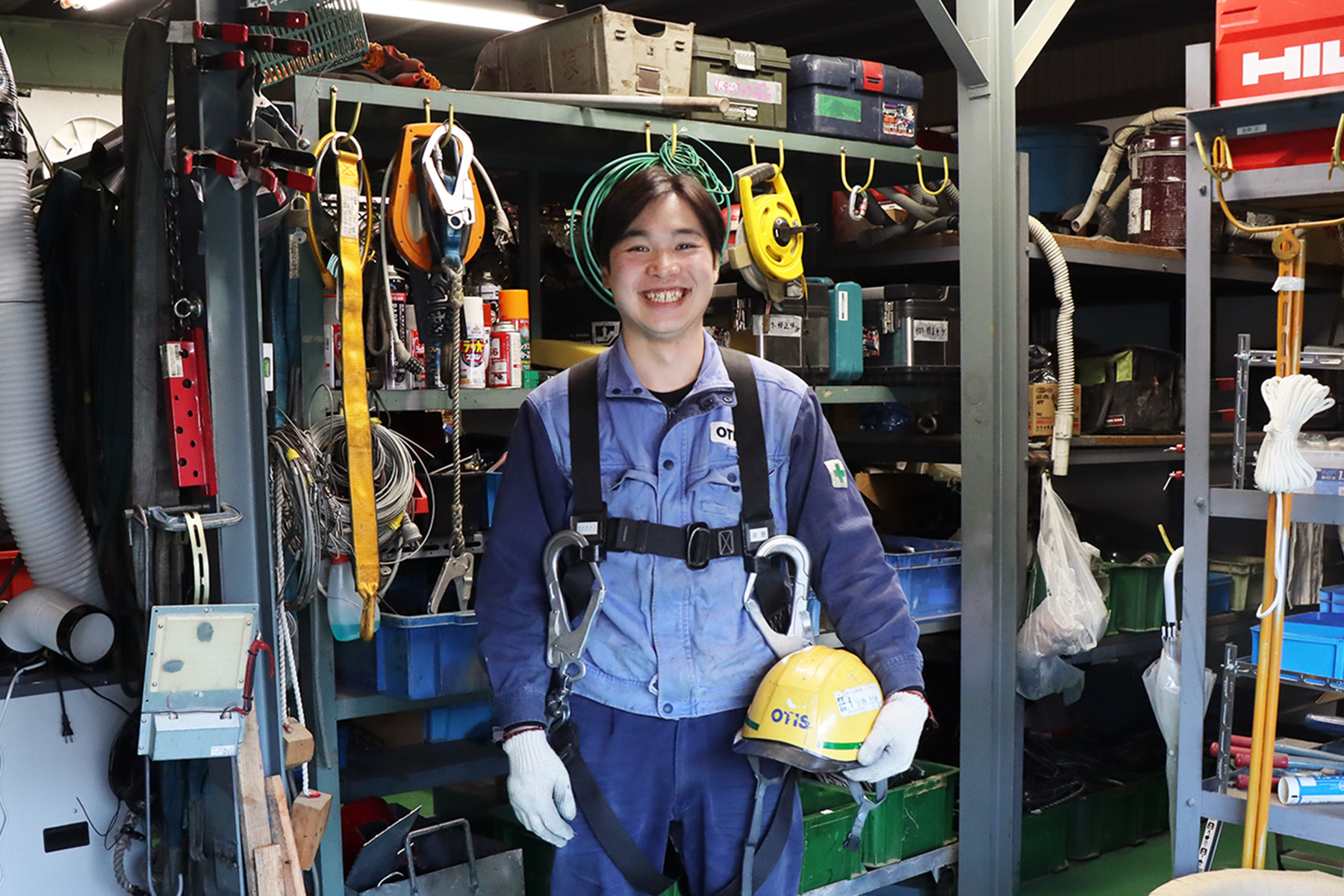 最初はエレベーターの中には入らず、外側から先輩の作業をサポートしていきます。必要な工具や機械を渡したり、資材を運んだりしながら、使い方や名前を覚えるところからスタートです。